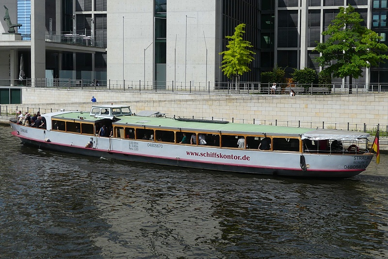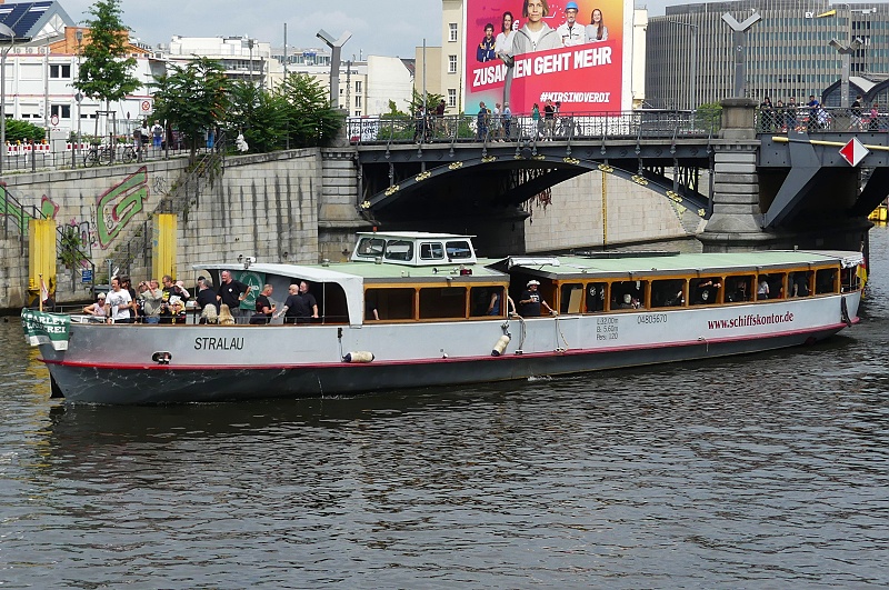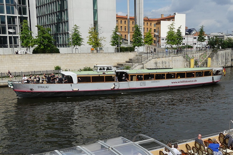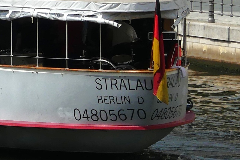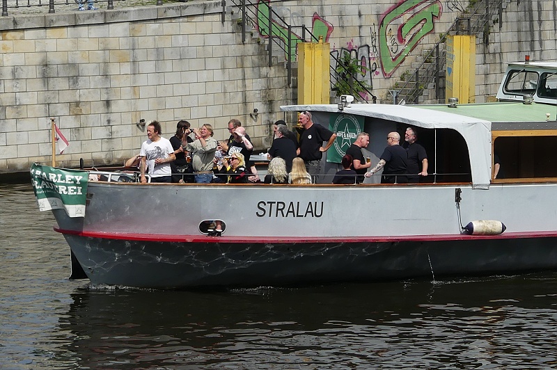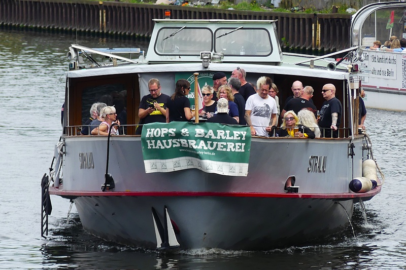 der MS Schiffskontor GmbH Berlin am 27.07.2025 auf Konzertfahrt der Alt-Punk-Rocker 999 in Höhe Bundestag…die Band aus dem Jahr 1976 ist immer noch auf Tour mit den zwei Gründungsmitgliedern an Guitar und Vocals Nick Cash and Guy Days…im Bild ganz vorn auf dem Schiff im weissen Shirt steht der aktuelle Drummer Stoo Meadows…die Drums erkennt man schon im Achterschiff aufgebaut…auf der Rückfahrt war die Gruppe dann in concert: