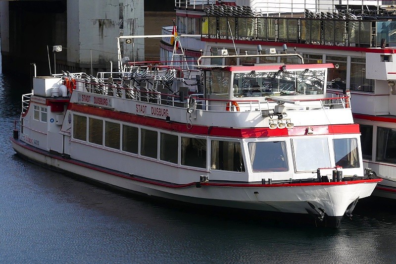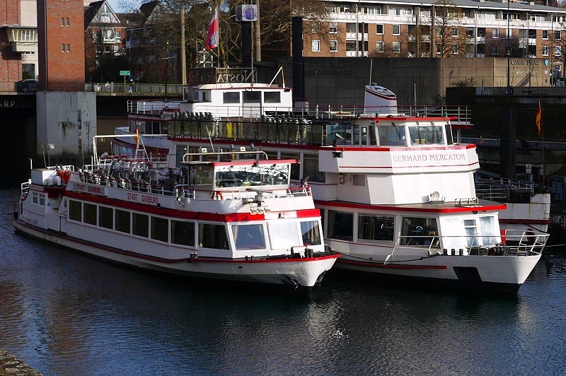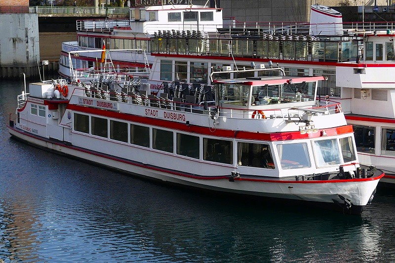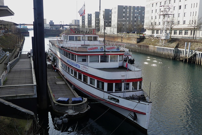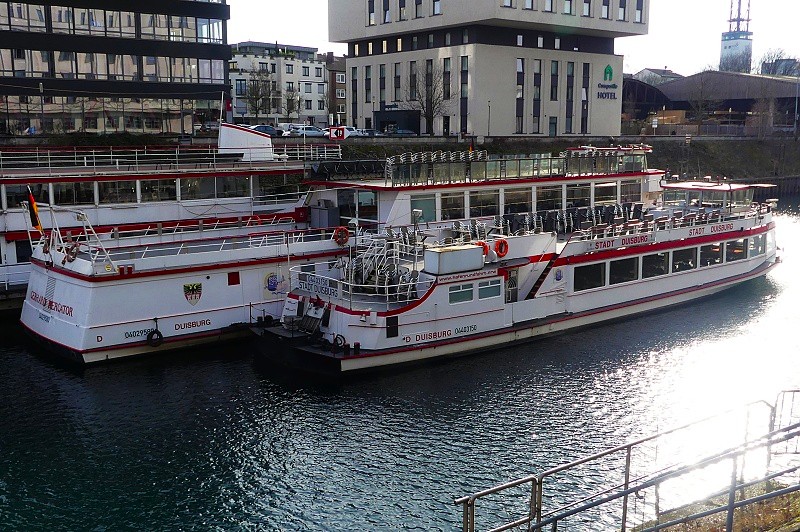 der WEISSE FLOTTE Hafenrundfahrt Duisburg GmbH am 09.02.2025 an seinem Liegeplatz im Duisburger Innenhafen in Höhe Schwanentorbrücke: