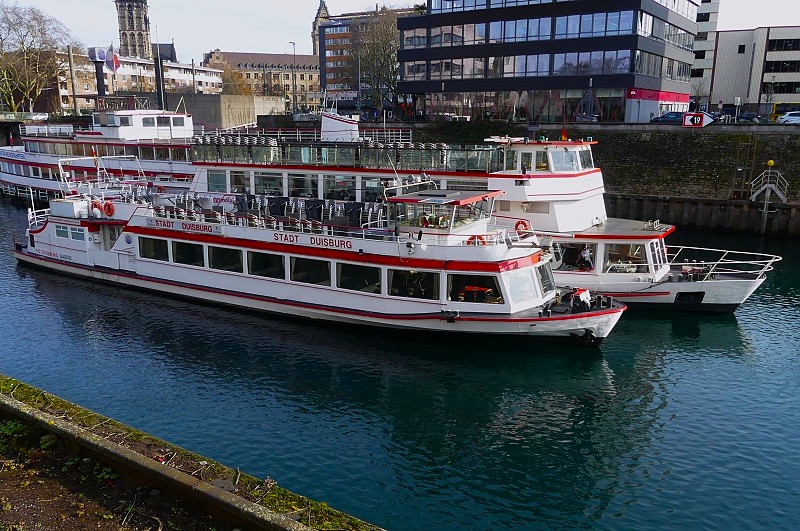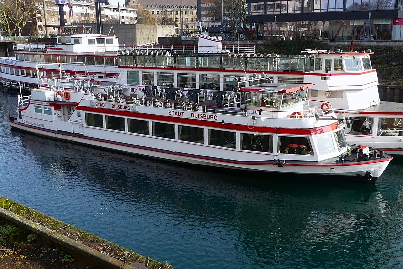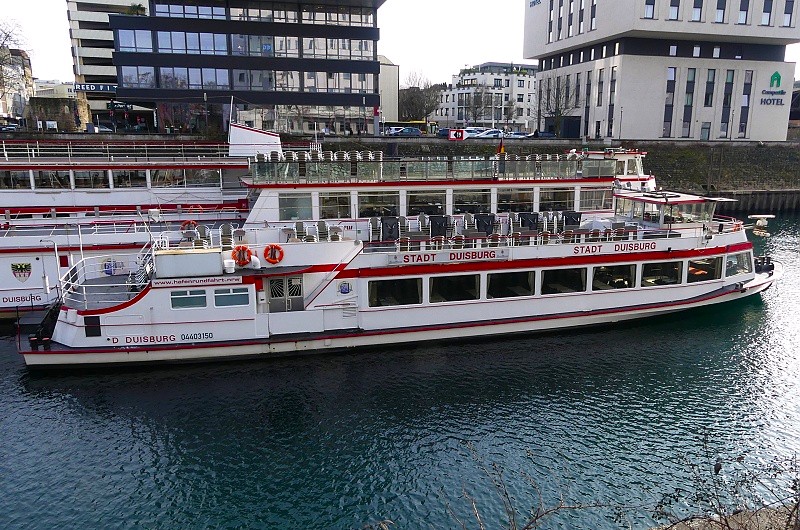 der WEISSE FLOTTE Hafenrundfahrt Duisburg GmbH am 09.02.2025 am Winterliegeplatz im Duisburger Innenhafen in Höhe Schwanentorbrücke: