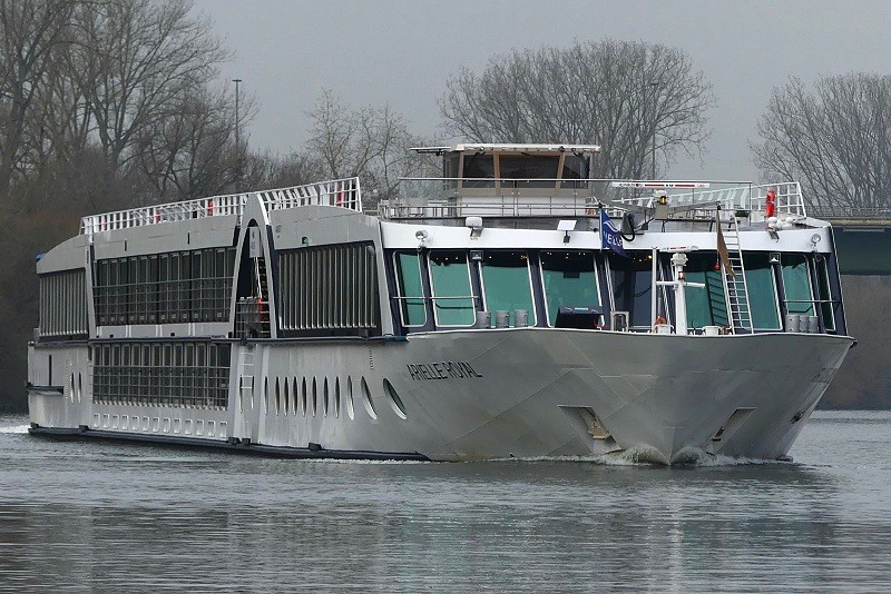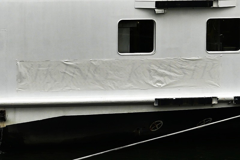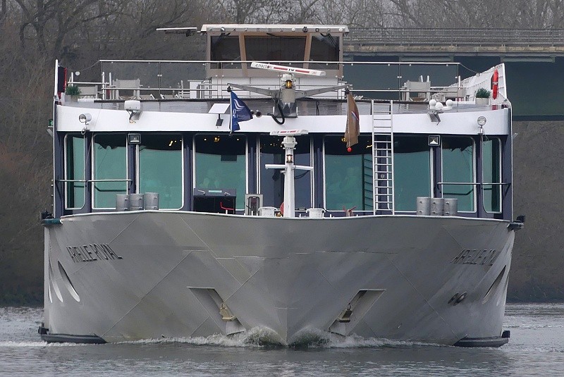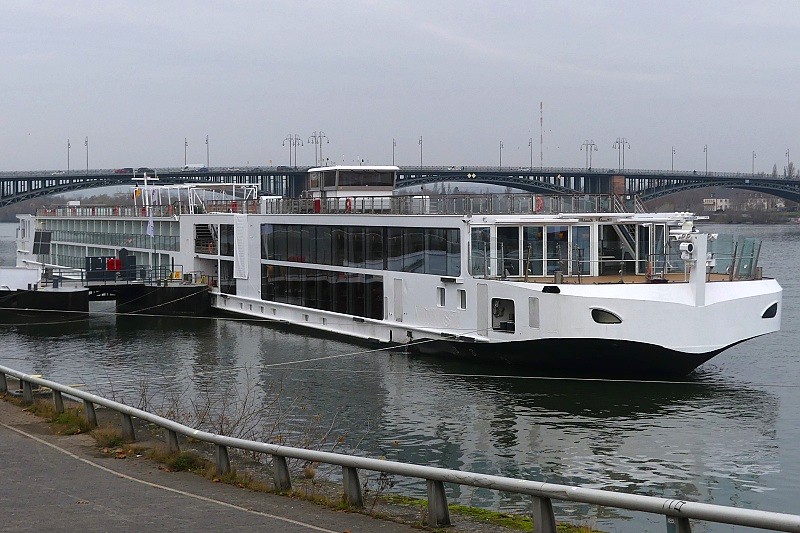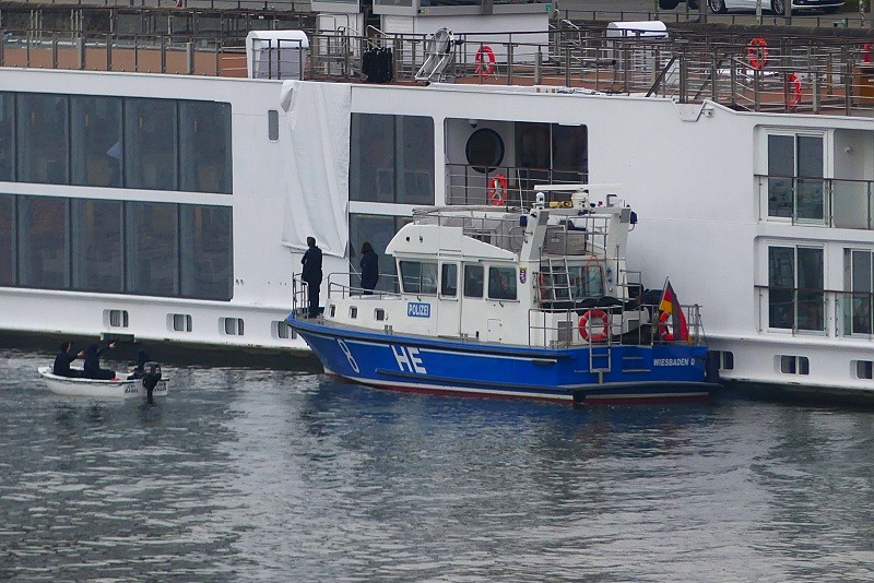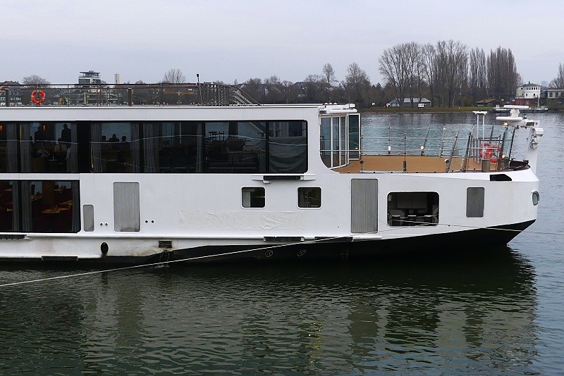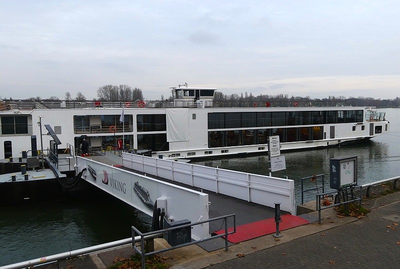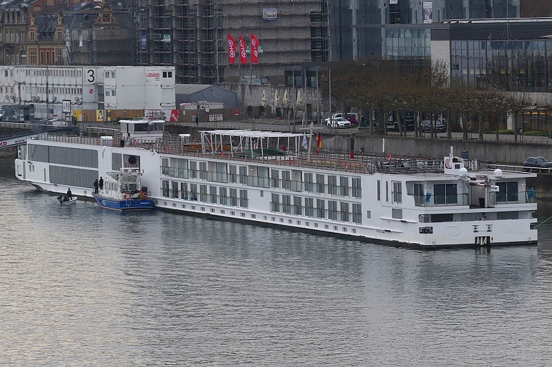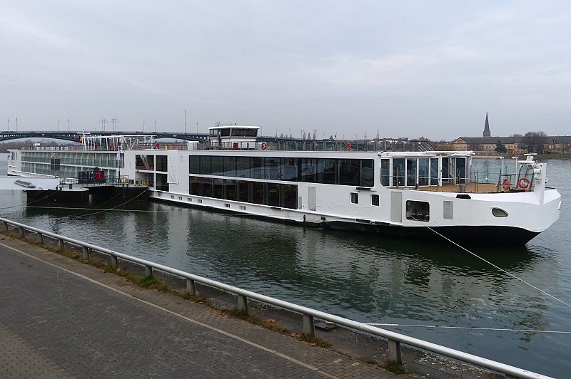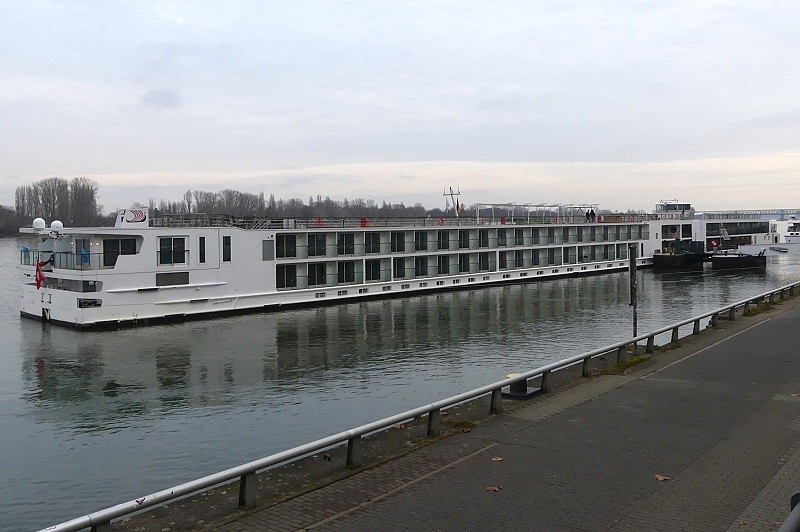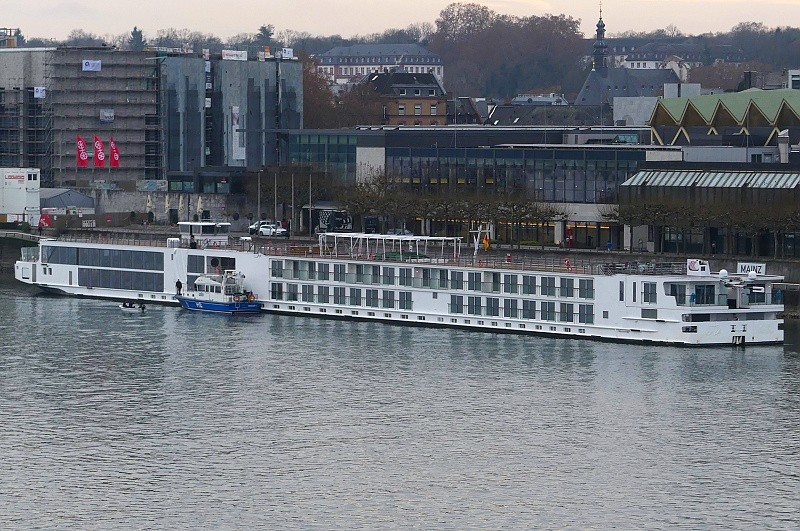 am 03.12.2025 “incognito” (Name und ENI abgeklebt) am Schiffsanleger A1 am Adenauer-Ufer in Mainz:
