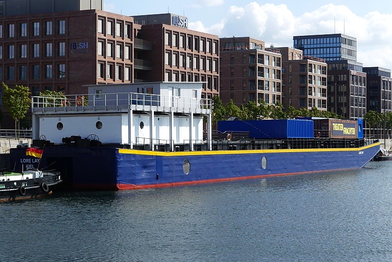 der Lore & Lay Theater GmbH am 15.08.2025 an seinem Liegeplatz in der Kieler Hörn am Willy-Brandt-Ufer…2018 wurde der Güterschubleichter USB 59 (ex Nola 3, Lehnkering-Montan 215, LRG 159) aus der Rheinschifffahrt von den Eigentümern Martina Riese und Thomas Hamann von der Kieler Friedrichwerft und bei TKMS aufwendig zum grössten und modernsten Privattheater Schleswig-Holsteins aus- und umgebaut: