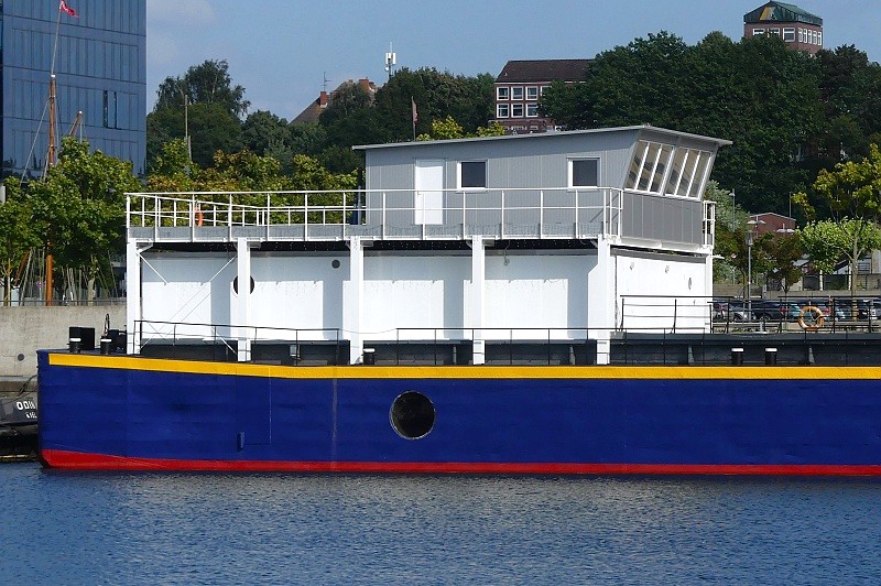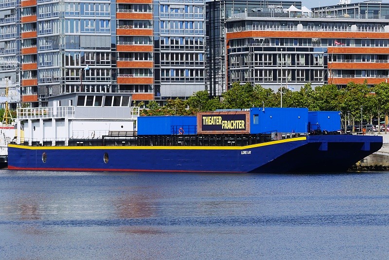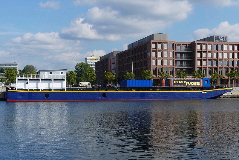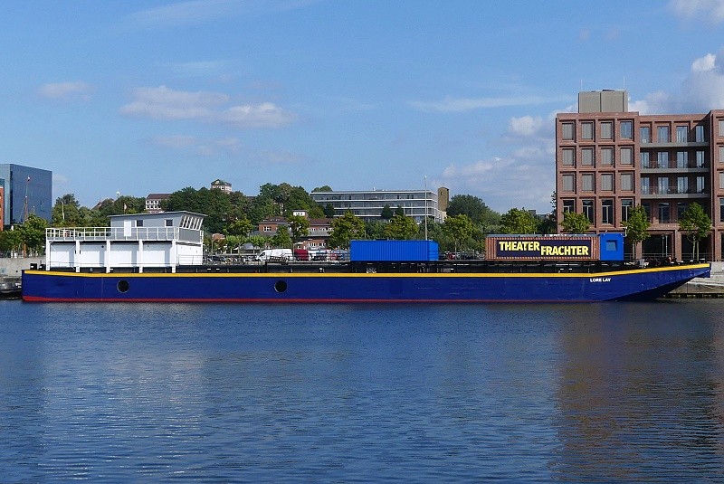 der Lore & Lay Theater GmbH am 15.08.2025 an seinem Liegeplatz in der Kieler Hörn am Willy-Brandt-Ufer…2018 wurde der Güterschubleichter USB 59 (ex Nola 3, Lehnkering-Montan 215, LRG 159) aus der Rheinschifffahrt von den Eigentümern Martina Riese und Thomas Hamann von der Kieler Friedrichwerft und bei TKMS aufwendig zum grössten und modernsten Privattheater Schleswig-Holsteins aus- und umgebaut: