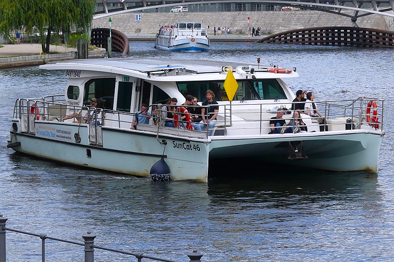 der BWTS Berliner Wassertaxi – Stadtrundfahrten Berlin am 27.07.2025 auf Spreerundfahrt in Höhe Bundestag: