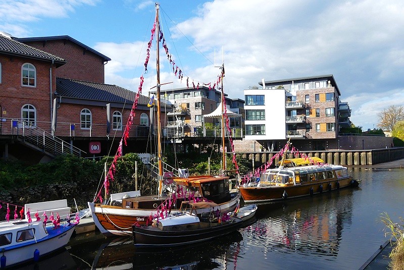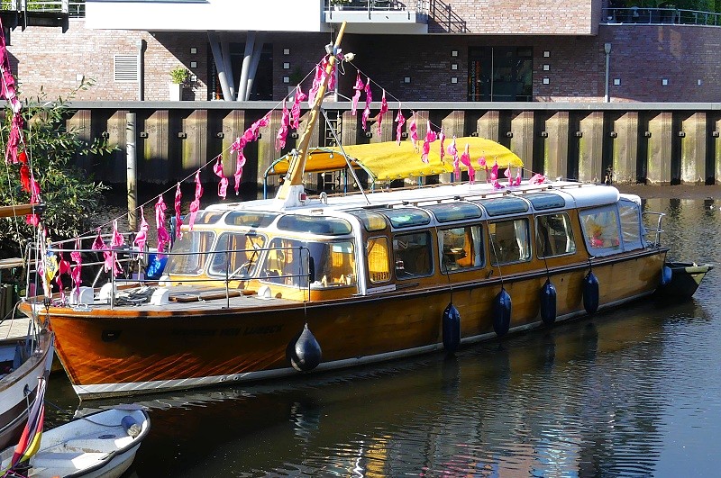 von Schiffseigner Andre Christoleit am 30.09.2025 am Liegeplatz im Buxtehuder Hafen…die ehemalige aus Mahagoni gebaute Lübecker Hafenbarkasse der Lübecker Hafen-Gesellschaft war das vorletzte Gäste-und Ausflugsschiff der LHG…heute werden mit ihr individuelle Touren zwischen Hamburg und Cuxhaven ab drei Stunden angeboten…der “etwas andere” Flaggenschmuck über die Toppen mit rosa Büstenhaltern hatte folgende Bewandnis…wer im Oktober (dem internationalen Brustkrebsmonat) durch die Buxtehuder Bahnhofstrasse oder am Fleth spazierte, konnte sie kaum übersehen, die Girlanden aus pinken BHs, die quer über die Strasse und sogar am Mast des Ewers MARGARETA und anderen Booten flatterten….hinter der ungewöhnlichen Aktion stand Beatrice Kietzmann mit ihrem Team von „Sie – Dessous und mehr“…gemeinsam wollten sie ein starkes Zeichen für die Brustkrebsvorsorge setzen, als Weckruf und Aufrütteln: